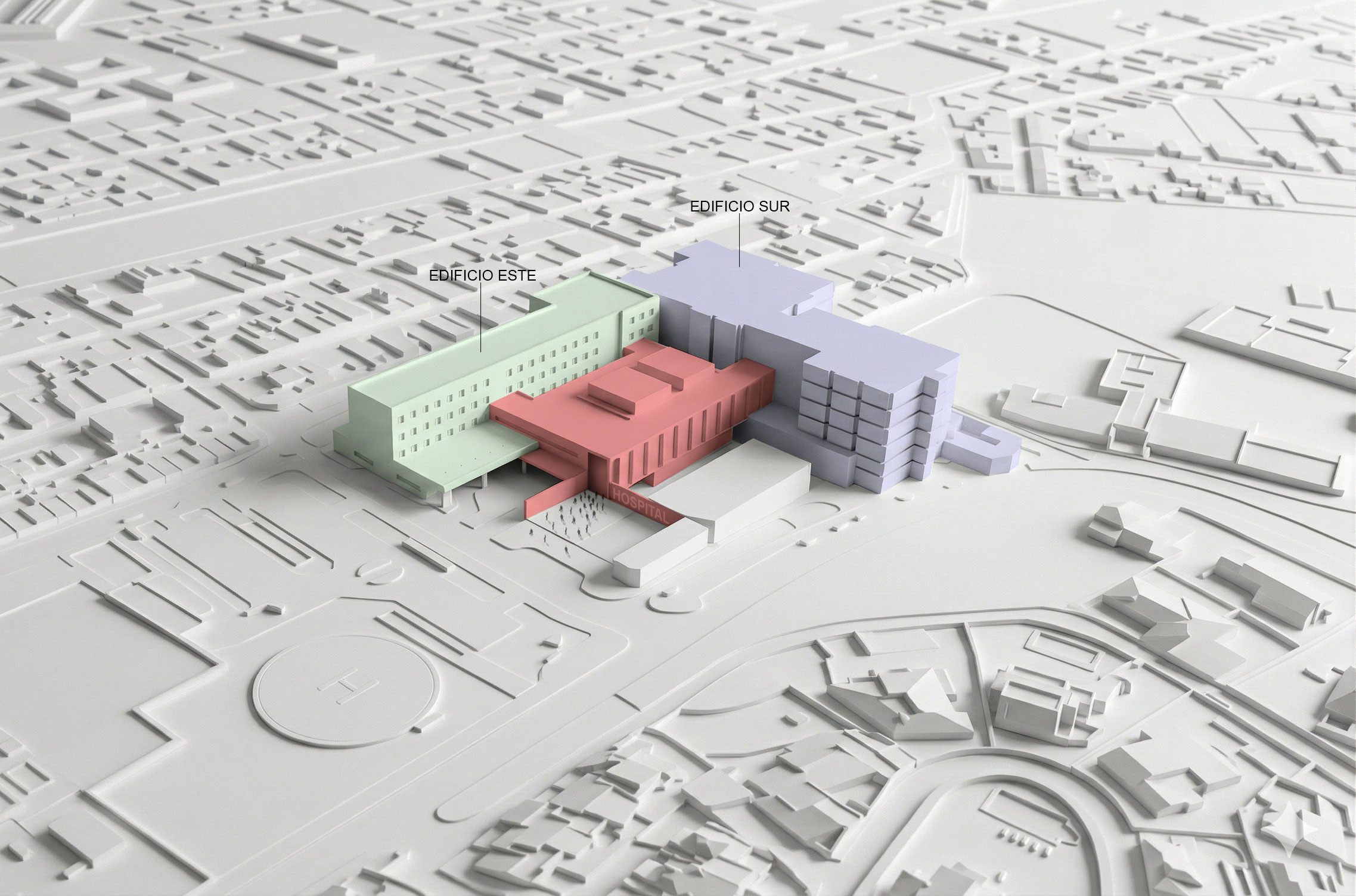 Propiciar el acceso por el nivel +0 como la entrada principal al hospital tiene un impacto muy positivo en la percepción hacia la ciudad. La fachada norte es la de mayor protagonismo del edificio porque no tiene frente a ella edificaciones que asfixien al acceso. La idea de proponer una gran plaza como espacio previo al acceso marcan la nueva puerta de entrada del hospital y le da una dimensión urbana proporcionada a su escala, sin necesidad de salvar desniveles para entrar al edificio y con acceso directo a las nuevas zonas de la ampliación, al edificio de consulta externa y al nuevo núcleo de visitas de las unidades de hospitalización. Un edificio hiperconectado donde el usuario se orienta con naturalidad.