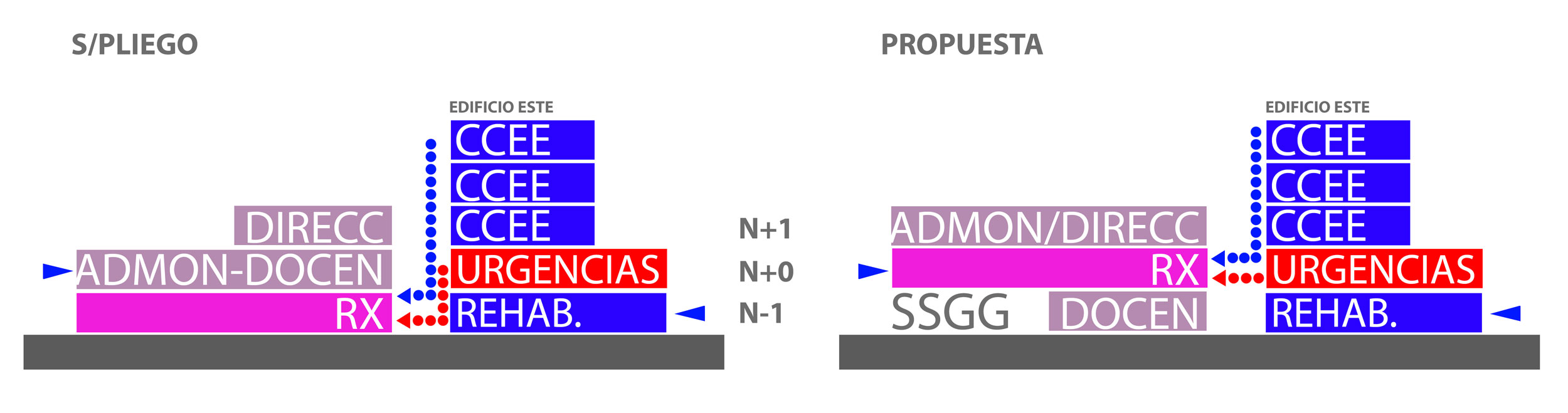 El fortalecimiento de la relación entre las áreas de Urgencias y Diagnóstico por imagen era primordial respondiendo a una lógica estricta de eficiencia, seguridad del paciente y optimización de recursos. Por ese motivo, propusimos reconfigurar los niveles situando el área de Diagnóstico por imagen al mismo nivel que Urgencias. Su acceso desde las áreas de Consultas Externas (ahora un nivel por encima) debe ser a través del ascensor público. En este nivel -1 se propone la cafetería por su conexión directa al exterior y la docencia.