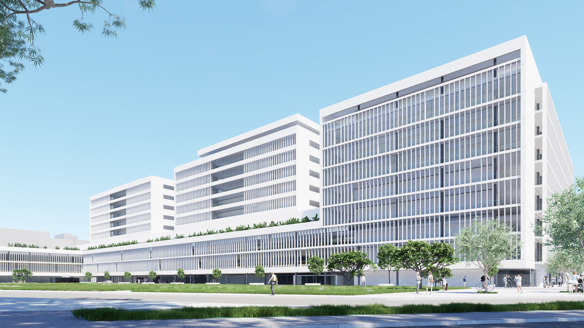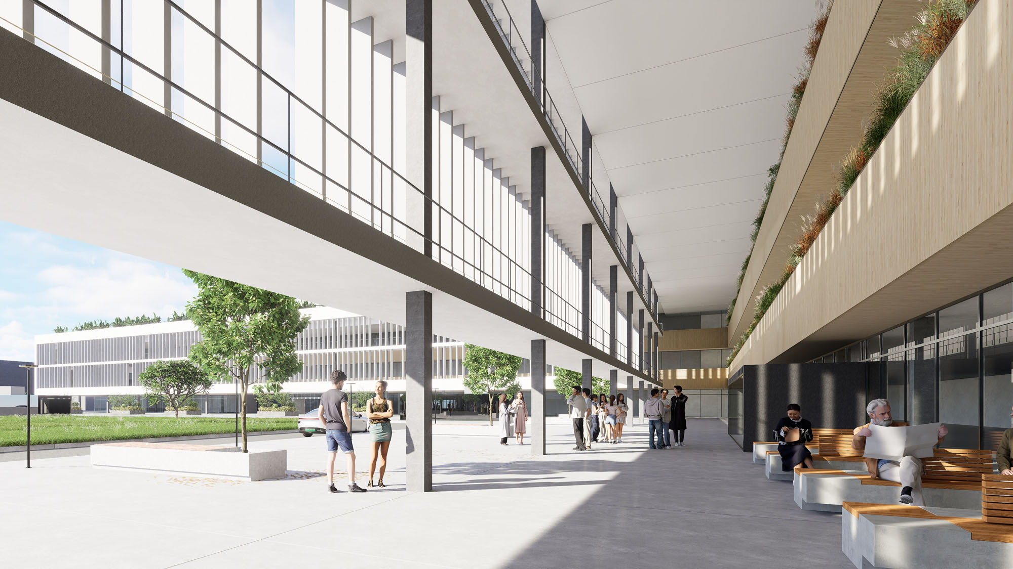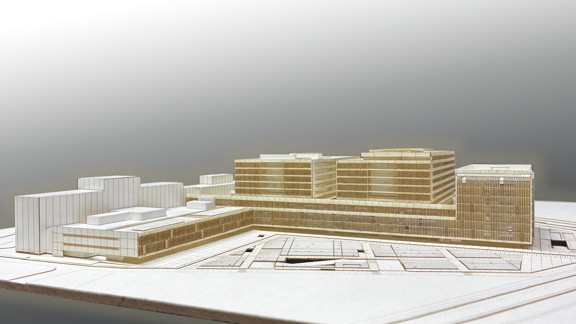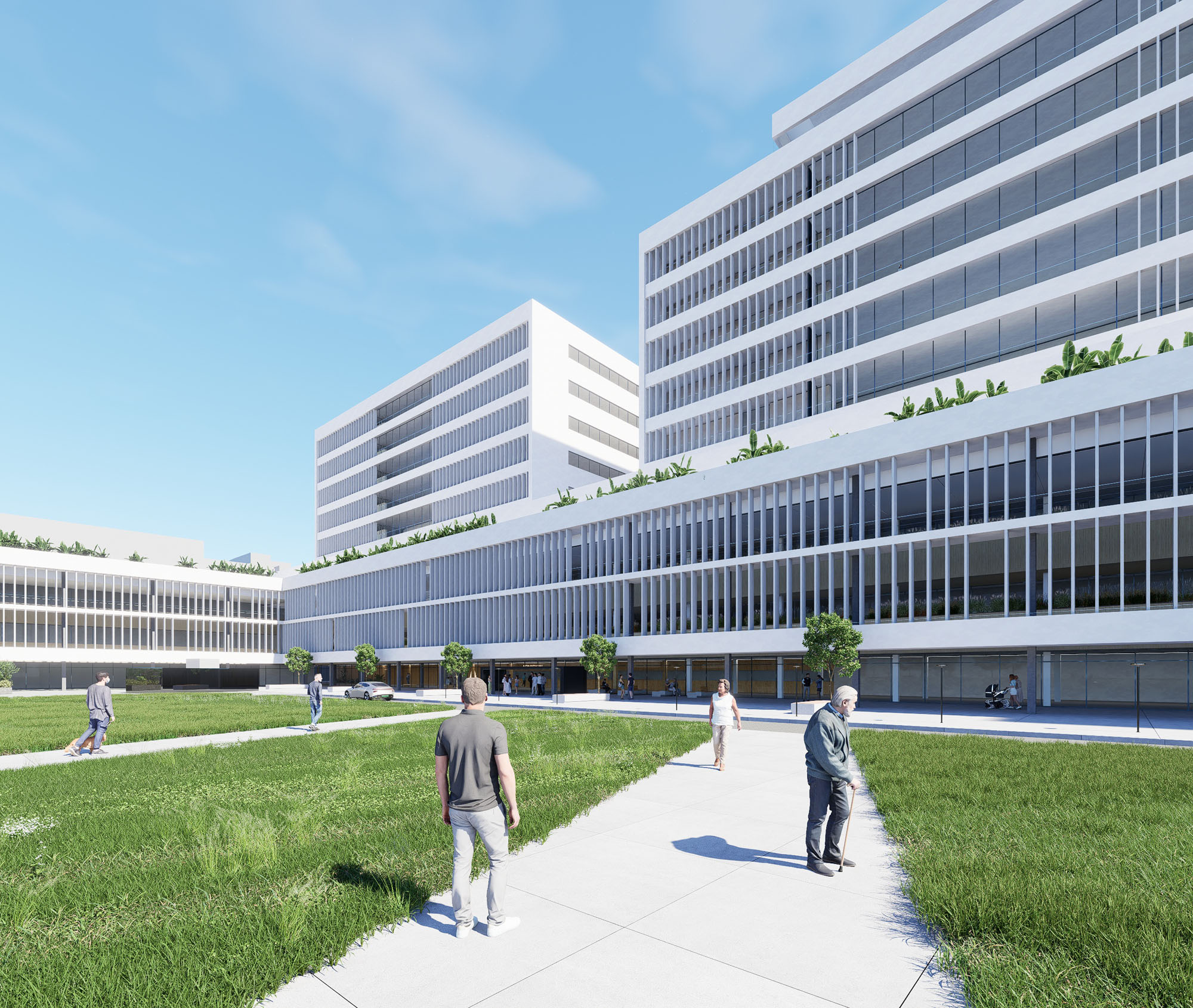 Por otro lado, las intervenciones de calado en hospitales existentes no deben circunscribirse solo a resolver el programa funcional, deben aprovechar la oportunidad para aportar valor a la intervención, mejorando el contexto urbano y los espacios públicos para el ciudadano. En ese sentido nuestra propuesta genera una nueva fachada para el conjunto hospitalario, extendida al edificio AB, con una nueva plaza pública ejecutada sobre el aparcamiento que actuará como atrio de todo el hospital.
