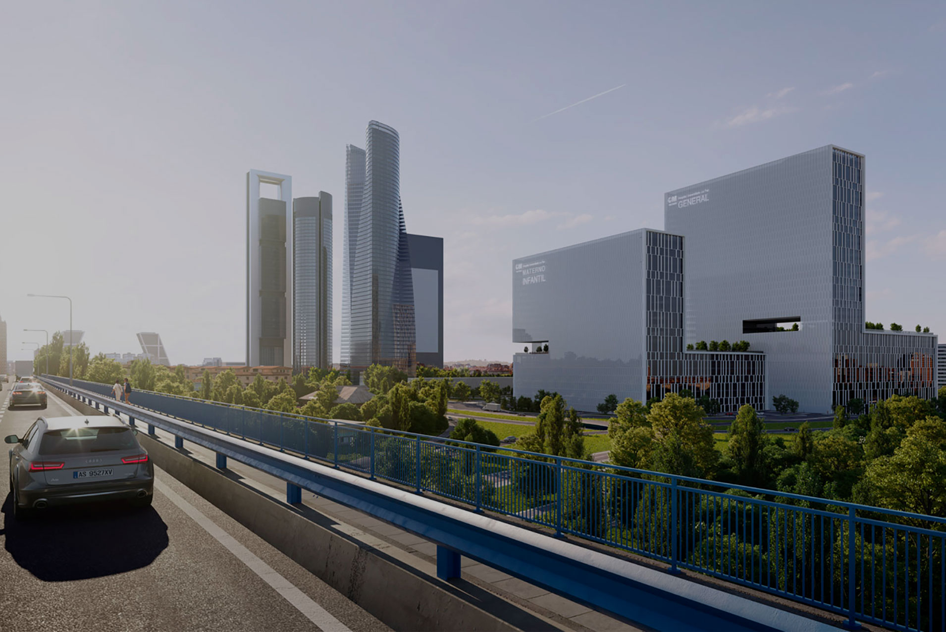 L’ensemble hospitalier (Hôpital Général et Mère-Enfant) se conçoit avec une volumétrie très épurée, selon un schéma socle + tour, où un simple geste formel, dicté par la géométrie de la parcelle, permet d’identifier l’hôpital comme deux grandes formes en L imbriquées : l’Hôpital Général tourné vers le Campus de Médecine et l’Hôpital Mère-Enfant orienté vers la Castellana, libérant ainsi une grande partie de la parcelle. Le bâtiment d’Enseignement et de Recherche, associé à l’actuelle tour du Pavillon de Direction, constitue le contrepoint à la volumétrie massive de l’hôpital.