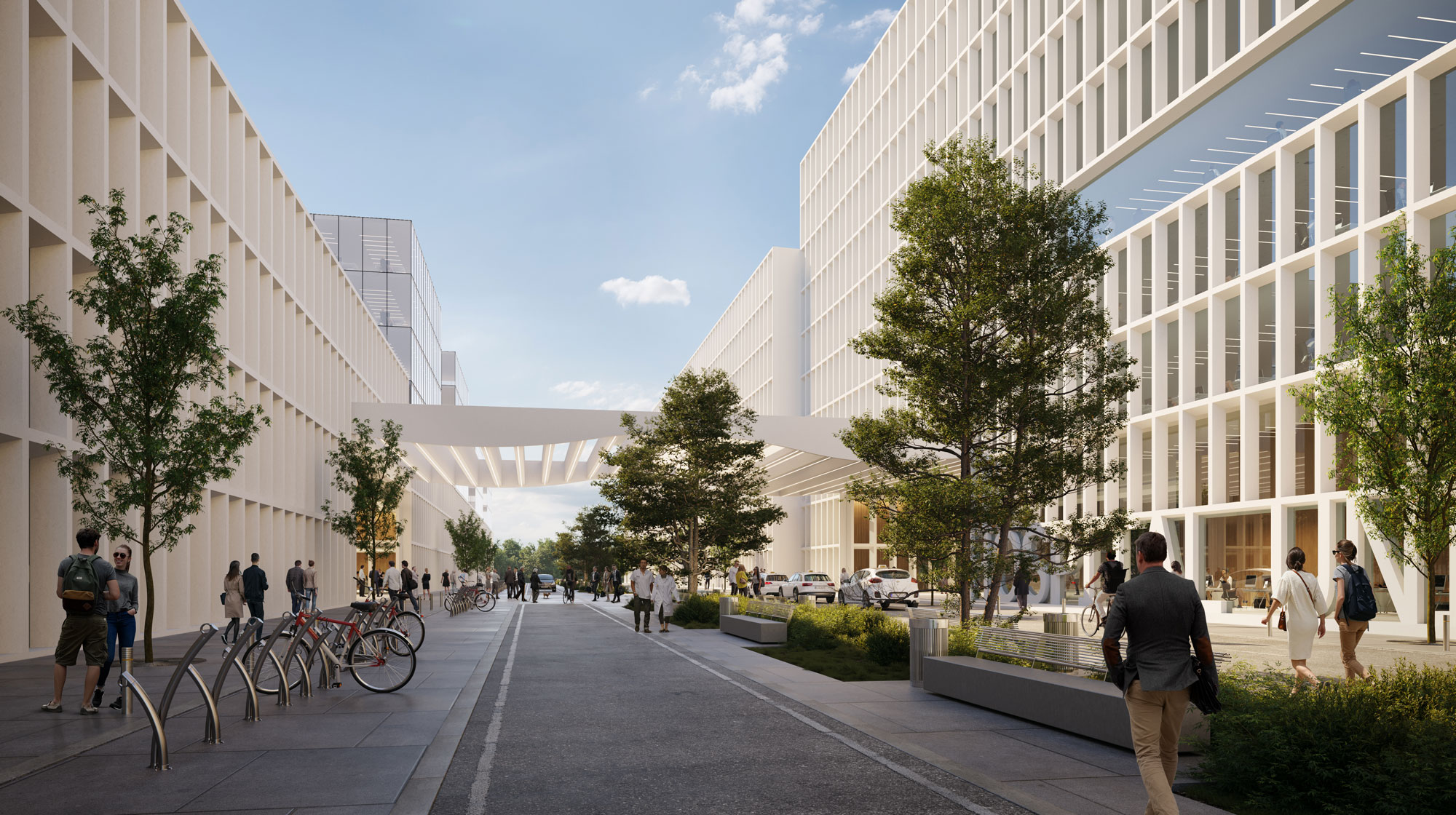 Es por ello que hemos creado al Oeste del hospital actual un bulevar conectado por ambos extremos al sistema viario general de forma que podamos contar con un nuevo acceso rodado y peatonal que permitirá al usuario acceder de forma sencilla y directa al hospital a través de un espacio muy urbano, con grandes espacios verdes cuya su configuración será como una plaza lineal antesala del hospital.