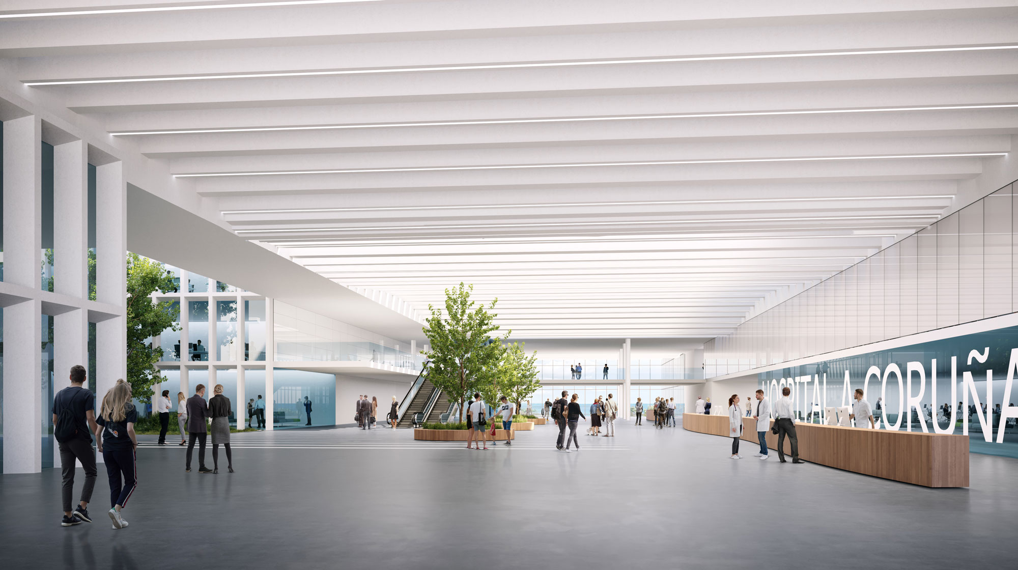 A continuación, se origina un gran vestíbulo con un esquema lineal en cascada hacia el este (zona dominante de vistas al mar) que permite al visitante acceder a las partes principales del edificio, pudiéndose identificar visualmente el punto de destino desde la misma entrada al hospital. Este planteamiento global no solo resuelve las necesidades de acceso público al hospital sino que, por su simpleza y su permanente comunicación visual con el espacio exterior, mejora de forma sustancial la orientación del usuario, su accesibilidad a los distintos servicios y en consecuencia su mejor percepción de la atención del sistema público de salud. El vestíbulo es el nexo de unión entre lo existente y lo ampliado, un espacio representativo del nuevo modelo de hospital.